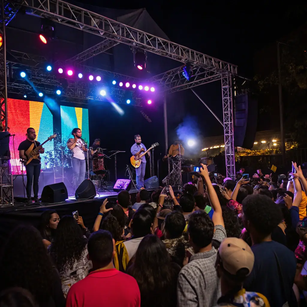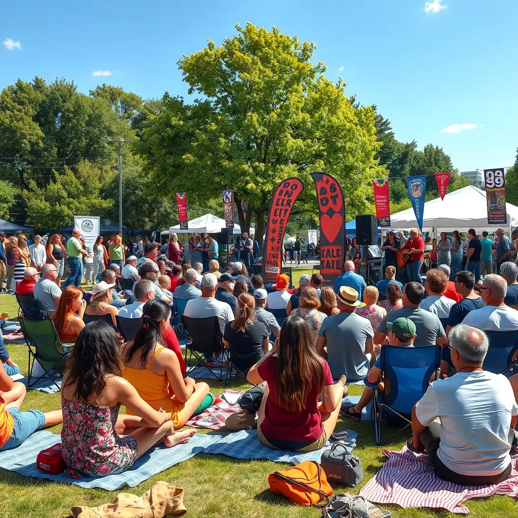 A photograph capturing a lively outdoor music festival scene, with a band performing on stage and a diverse crowd enjoying the music and atmosphere.